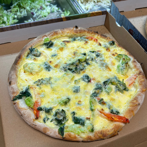 Hähnchen-Döner, Paprika, Champignons, Brokkoli, Sahnesoße,Fladenbrot und Käse überbacken,